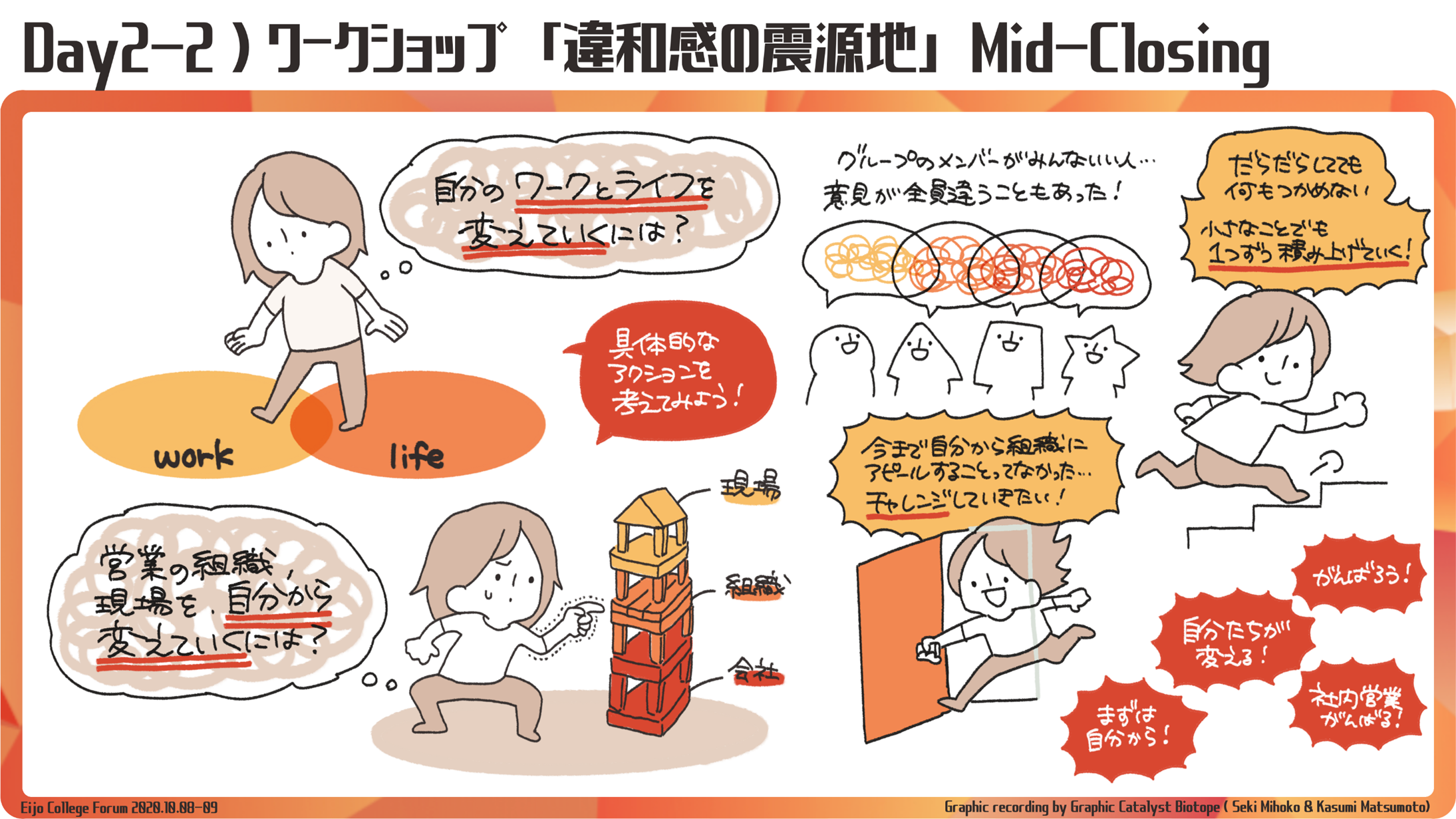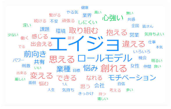 エイカレでは、まずは自分自身のライフとキャリアを見つめ直し、異業種からの刺激を受け、ありたい自分を再設定することで、一歩踏み出すマインドセットを整えます。その後、営業という職種が抱える本質的な課題に向き合い、突破口を開くスタートを切るのですが、フォーラム初日のこのアンケート結果と、実証実験の最終ステージで見せるエイジョ達のキラキラした姿の落差は、エイカレの見どころの1つと言えるかもしれません。