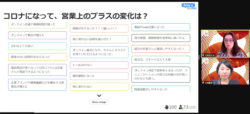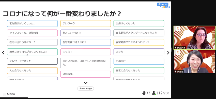 コロナによる変化については、 「家族と過ごす時間が増えた」、「在宅勤務が当たり前になった」、「無駄な立ち待ちがなくなった」という一方で、 「太った」、「運動不足になった」という意見も多数あがり、 ”新しい生活様式あるある ”の共有で会場が盛り上がりました。