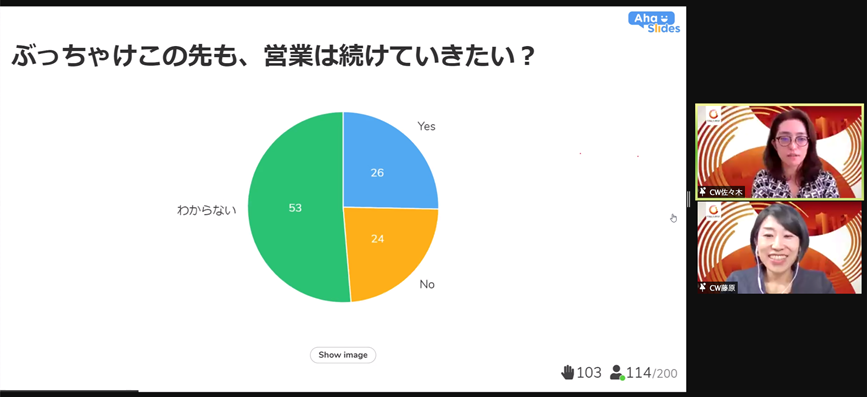 最後の質問は、例年必ず聞く「ぶっちゃけ、この先も営業は続けていきたい?」という質問です。