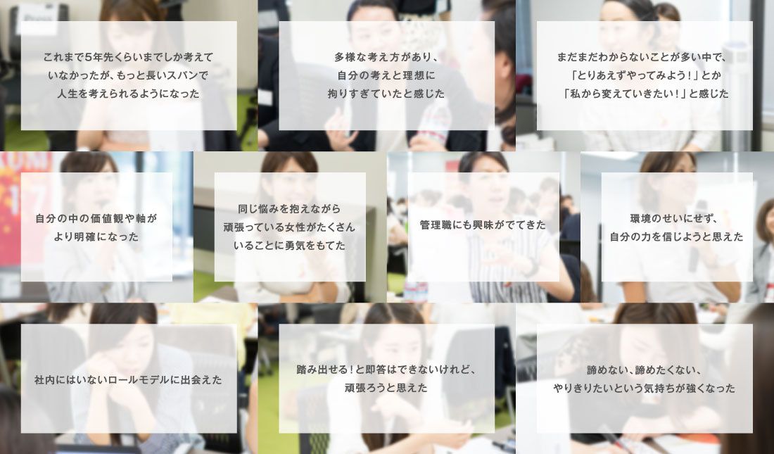 一方、役員が全員男性で、数字としては知っていたものの「すごく偏っていることを目の当たりにしてショックだった」という発言や、女性だからといってゲタを履かせられて管理職になるのではなく、中身も伴っていないとダメだと痛感したという意見もありました。