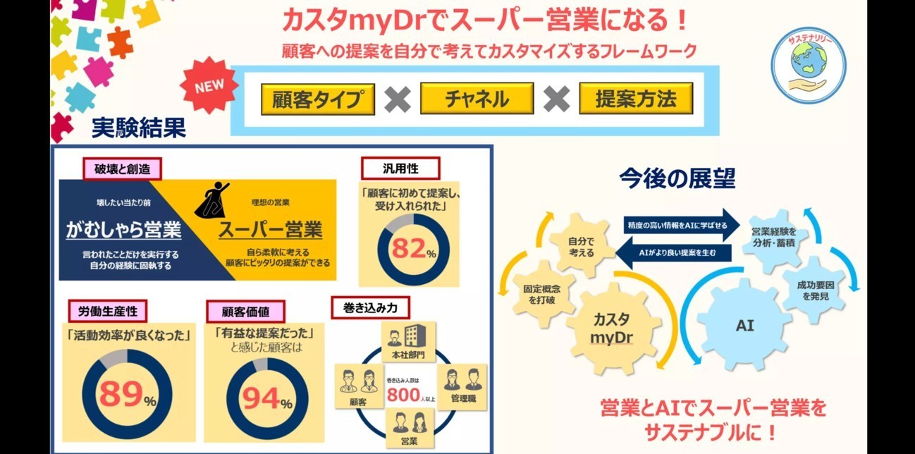 実証実験では、顧客に最適な提案を可能にするために「カスタmyDr」を作成。成功事例のヒアリングから要素を抽出し、顧客タイプやチャネル、提案方法を整理したフレームワークを作りました。最終発表(サミット)の審査員からは、従来の営業スタイルの「当たり前」に真正面から向き合い、ビッグデータ活用の未来を提言した点を高く評価する、というコメントが送られています。